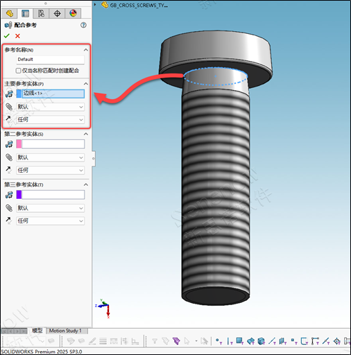 在 SOLIDWORKS 2025 SP 3 版本中增加了对紧固件的 AI 智能识别,对于没有“配合参考”且不是“Toolbox”零件的紧固件可以在拖入的过程中 SOLIDWORKS 能够识别看起来像螺丝、垫圈、螺母的零件,并自动向零部件添加配合。
