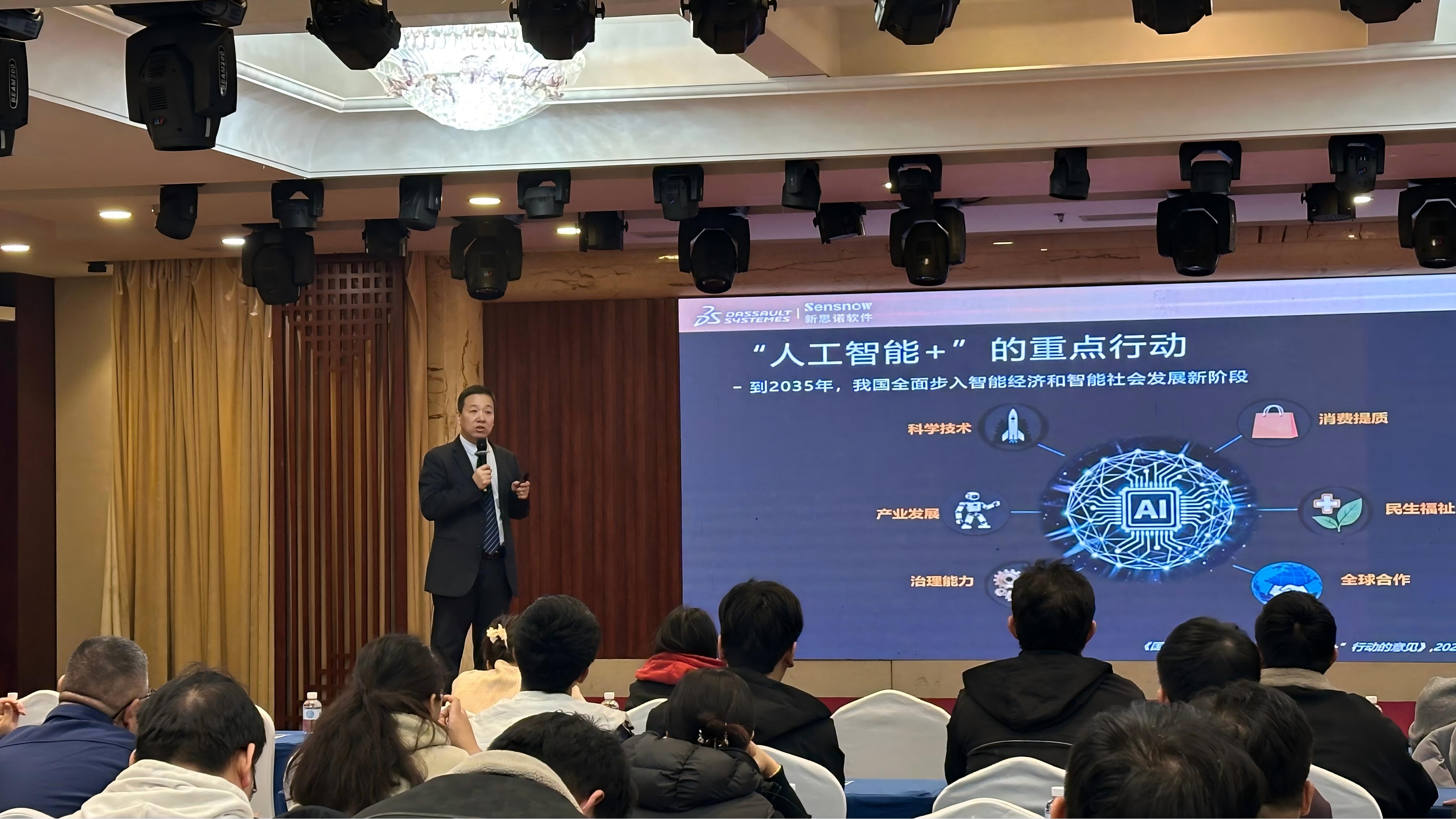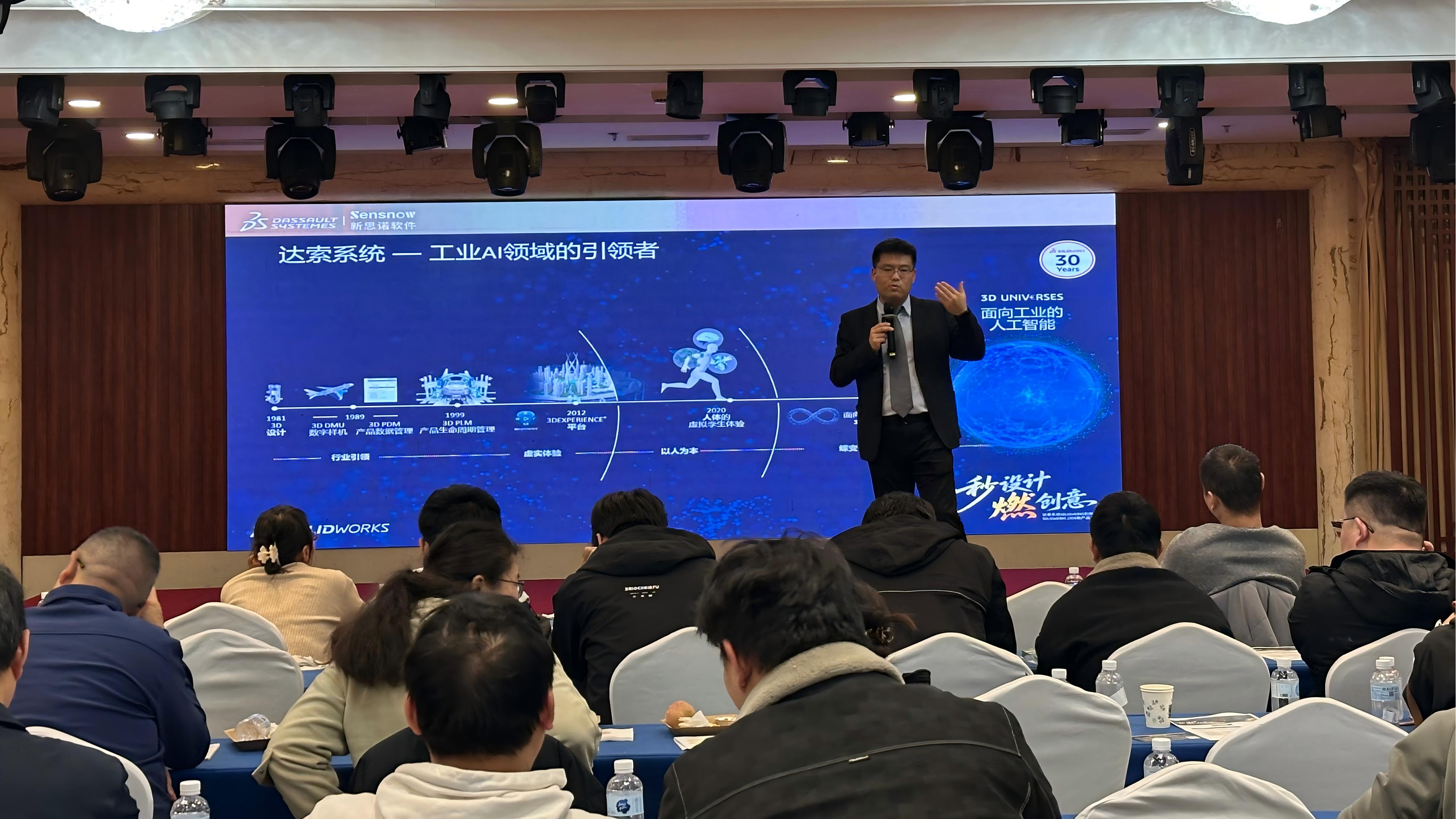 新思诺软件济南BU销售总监王总开场带来“秒设计,燃创意”主题演讲。他带领大家回顾了SOLIDWORKS自首个版本发布30年来的发展历程,强调其“让每位工程师享用3D实体建模强大功能”的初心。同时聚焦人工智能的行业变革力,指出AI是第三次认知革命的核心动力,正重塑制造业生态。结合我国“人工智能+”行动纲领与2035年智能经济愿景,分享了SOLIDWORKS 2026将AI深度融入设计流程,助力企业迈向数字化新目标,现场反响热烈。
