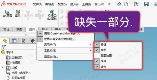 缺失按钮区一些必要模块区域,无法通过常规手段设定,常规的设定是在按钮区具体的选项卡【比如特征】上右键菜单显示出来。以及,按钮区选项卡上缺失部分功能的图标。