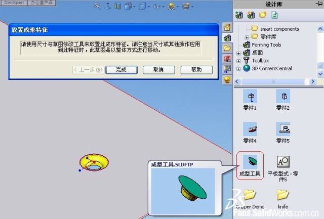 明白了原理,就可以用零件格式(*.sldprt)的文件生成成型工具了,不过,千万要记得,设计库中必须将此文件所在的文件夹设定为成型工具文件夹。新的成型工具使用如下(注意对比图三的成型工具预览框所显示的文件格式):