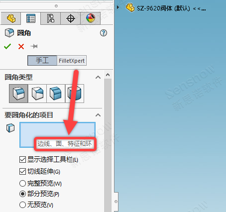 选择特征就是点选一个特征,比如一个拉伸特征,点中后此特征上的所有尖角处的模型边线都将被选中并参与倒角。