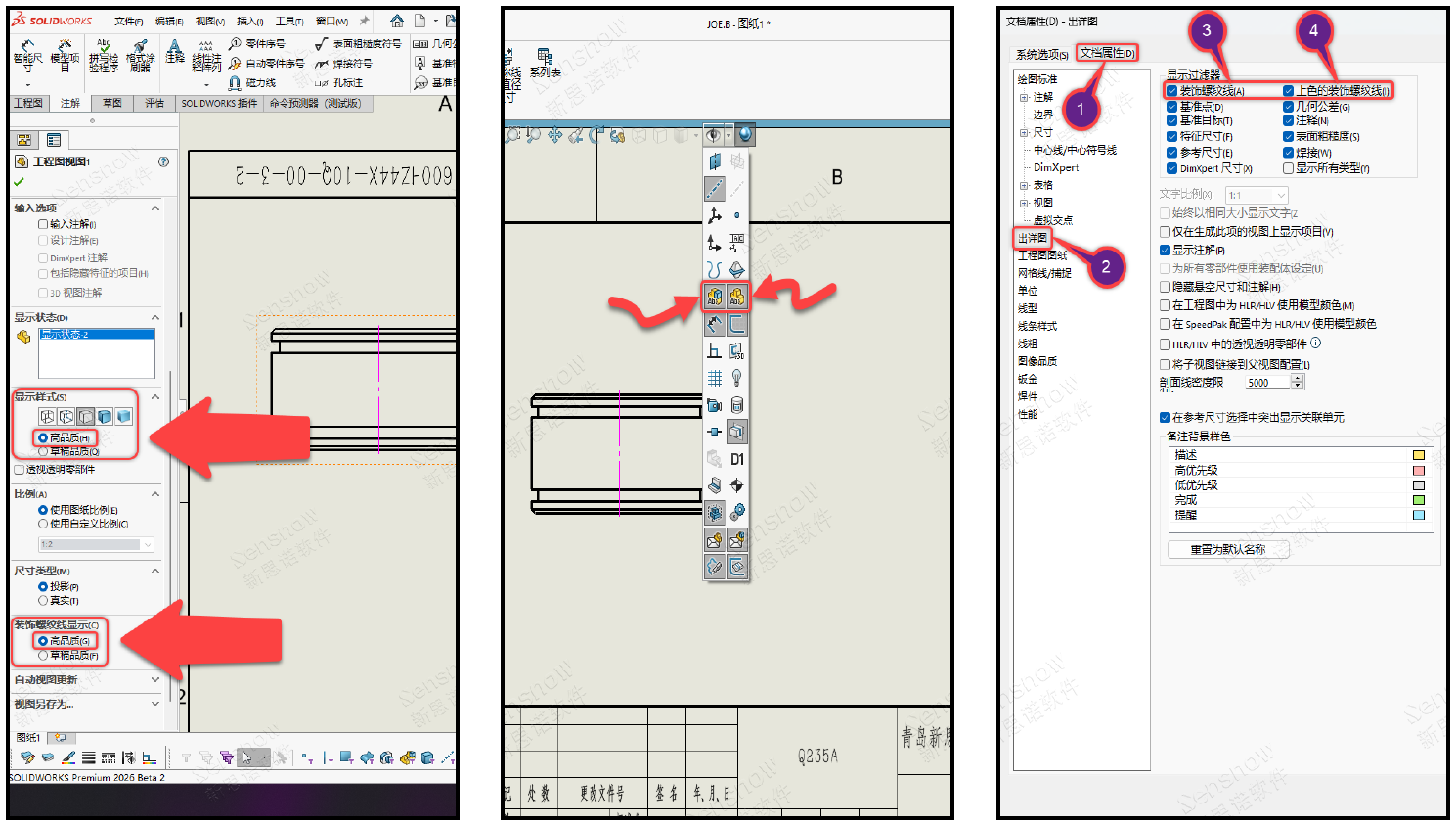 尝试点击工程图视图,在视图的属性中将显示样式和装饰螺纹线显示都更改为高品质。